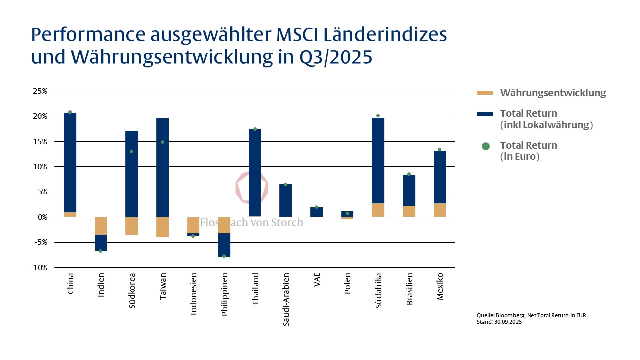 In Indien gelang hingegen trotz geldpolitischer Impulse der Umschwung nicht. Obwohl dort im zweiten Quartal der Leitzins gesenkt wurde, entwickelte sich der indische Aktienmarkt insbesondere im dritten Quartal rückläufig und büßte in Euro gerechnet 6,7 Prozent ein, nachdem US-Präsident Donald Trump Zölle von bis zu 50 Prozent auf Importe aus Indien angekündigt hatte.